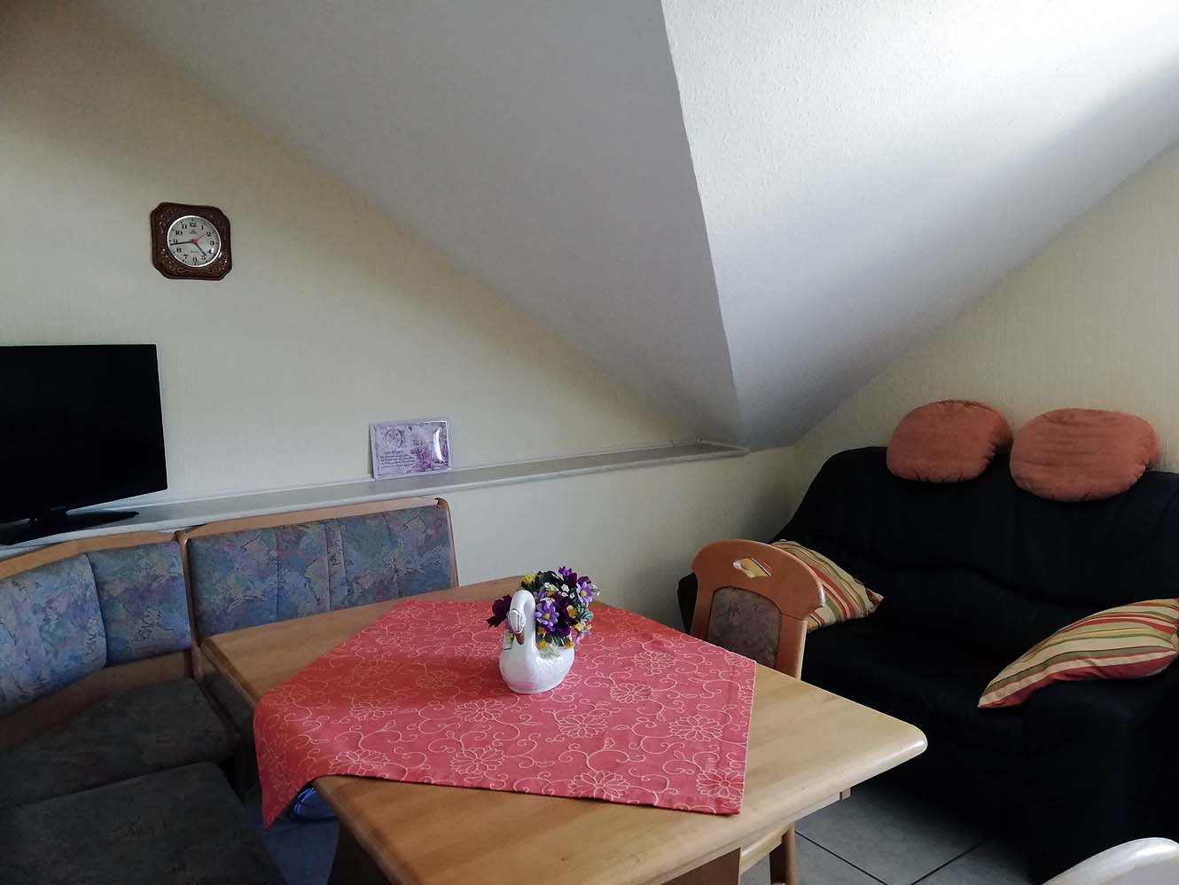 'T Is een net en schoon appartement,, de verhuurster is een hele vriendelijke dame. Alleen het ligt niet op de eerste maar op de tweede verdieping, daardoor moet je twee trappen naar boeven. In de beschrijving staat dat er twee gemakkelijke stoelen staan, het blijkt een tweepersoons bankje te zijn, waar je erg moet oppassen dat je je hoofd niet stoot bij het opstaan. Er zit een rare punt in het dak, er vlak boven. Het is een beetje krap allemaal. Het terras waar je kunt zitten te genieten van het uitzicht, is heel mooi, alleen je zit wel bij een ander voor het slaapkamer raam. Het is een gezamenlijk terras voor meerdere huurders. Op de foto waarvan je denkt dat het een woonkamer(met grote leren bank) is, blijkt een overloop te zijn om naar de volgende verdieping te komen. Dat is een plek waar je niet zo snel gaat zitten. Fietsverhuur blijkt niet meer te bestaan, maar je kunt wel de fietsen van de eigenaar lenen. Er is op 3 kilometer afstand een grotere supermarkt in Neumagen-Dhron. Kan niet missen, je rijd er recht op aan. De tuin met zonneweide zijn we niet tegengekomen, maar misschien is die er wel. Voor motorrijder is er wel mooie gelegenheid om de moters onder een afdak te stallen. Aan de voorkant open, maar ze staan wel droog.